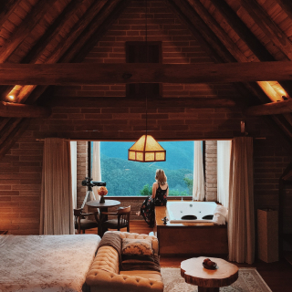 Expansive windows frame the mountains in our Luxury Mountain View Suites. A luminous space where you can work, relax, and reside without compromise. Perfect for: Discerning Executives & Extended Stays.